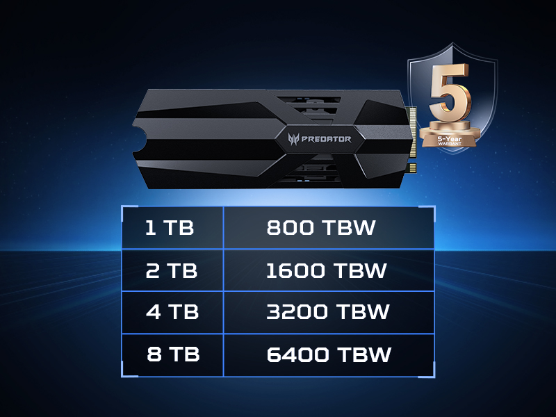 Predator GM9000 Heatsink is built with high-quality components, rigorously tested, and assembled under strict quality control to deliver dependable performance. From sustained gaming sessions to professional-grade content workflows, this drive is optimized to withstand intensive usage. With rated endurance up to 6400 TBW and a 5-year limited warranty*, it provides dependable, long-term value for demanding users. For a storage solution engineered to last and built to perform, choose the Predator GM9000 Heatsink.