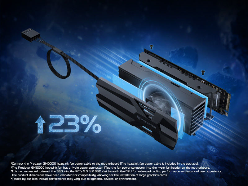 Predator GM9000 Heatsink is a high-performance PCIe Gen5x4 SSD featuring a dual-layer thermal cooling design that combines an enhanced heatsink and active fan. Engineered for sustained workloads and high-throughput scenarios, this Gen5 drive delivers read speeds up to 14000 MB/s and write speeds up to 13000 MB/s, supported by independent DRAM Cache of up to 8 GB. For gamers, creators, and technical professionals, GM9000 Heatsink is a faster, cooler, and more reliable solution that sustains throughput and stability under intensive I/O (Input/Output) conditions.