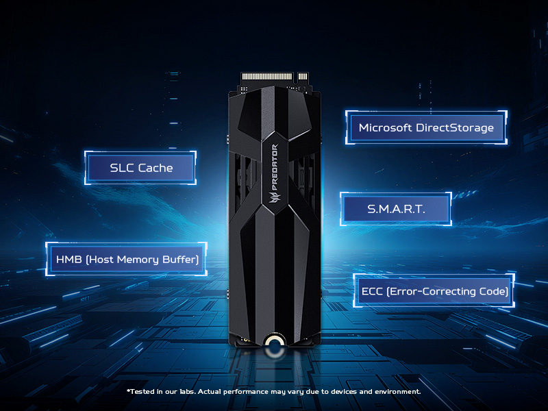 Predator GM9000 Heatsink integrates advanced technologies that maintain system responsiveness across diverse workloads, including power management, Microsoft DirectStorage, HMB (Host Memory Buffer), SLC cache and TRIM, wear leveling, and more. These technologies operate as a unified framework to ensure the drive remains more responsive, more stable, and more reliable even under heavy workloads.