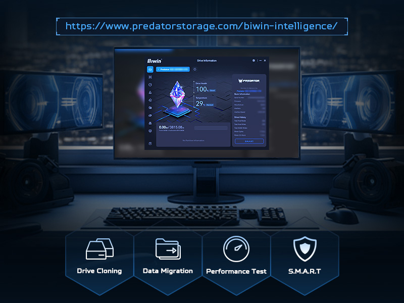 Predator GM9000 Heatsink is supported by Biwin Intelligence, a management software developed to maintain stable performance and data integrity over time. For a more convenient and safer storage experience, this software helps users manage their drives with features like performance testing, data migration, drive cloning, and more. Full control stays in your hands, all from one interface.